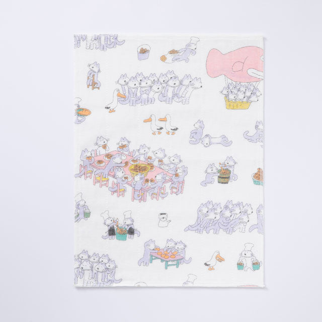 とらねこ大将ひきいる11ぴきのねこたちの愉快な物語。3世代にわたって楽しまれているロングセラー絵本シリーズが、かや織のふきんになりました。