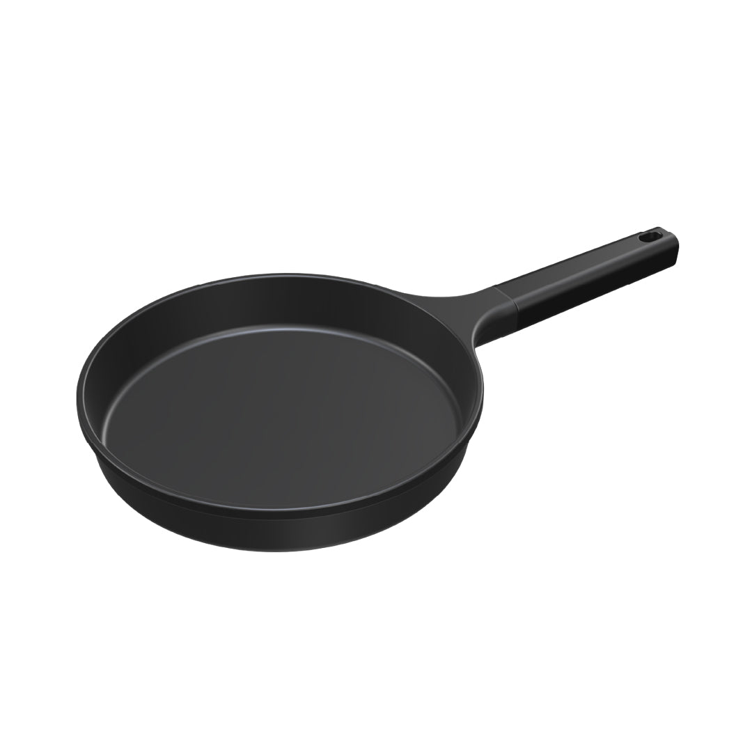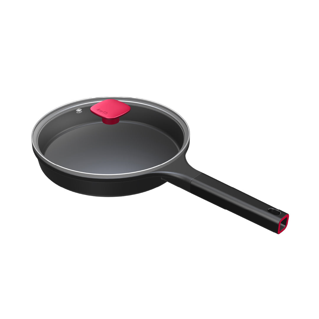 本体は平皿で多いとされる24cmより小さいボディ。フチとハンドルの上に、蓋のように皿を被せることで、油はねや側面に手が触れるなどの火傷をできる限り回避。盛り付け時の安全性にも配慮しています。