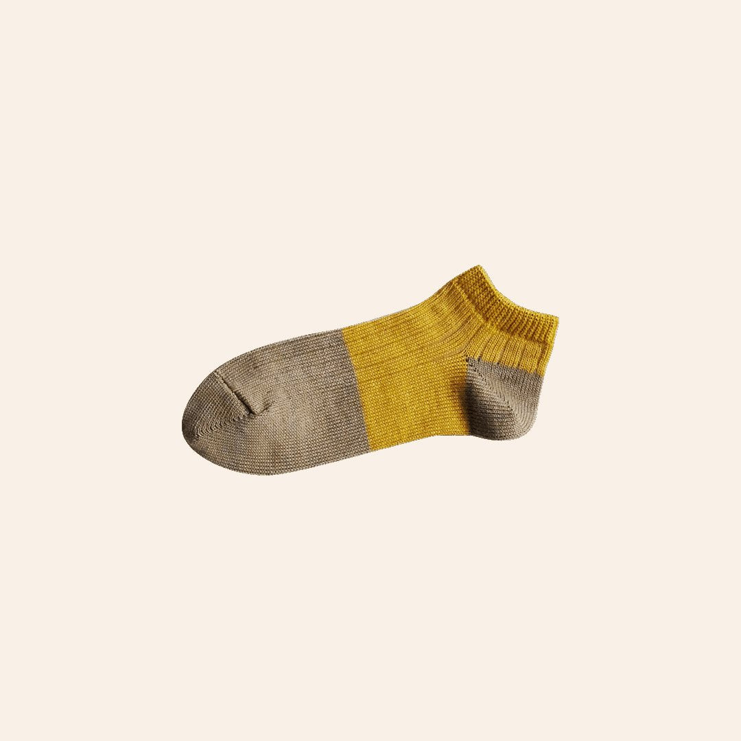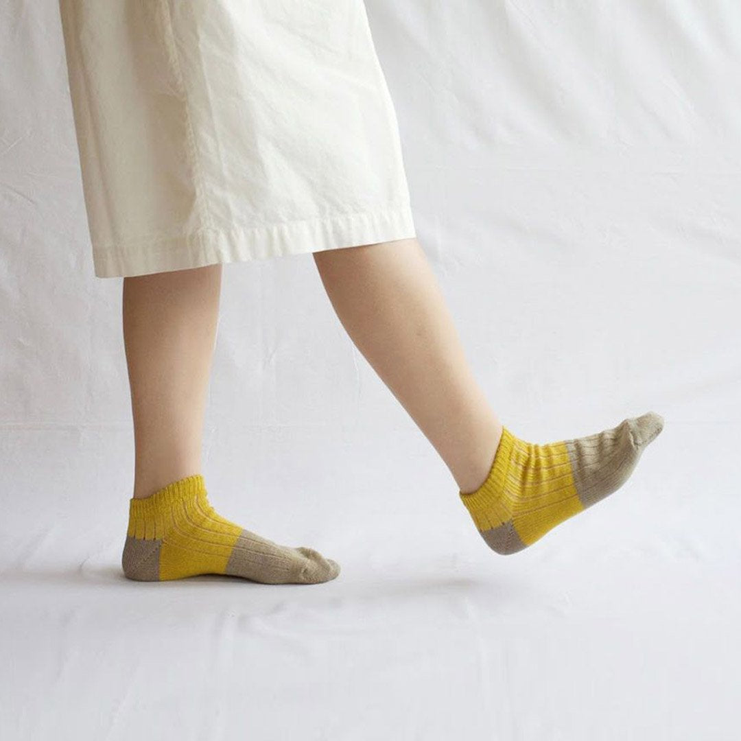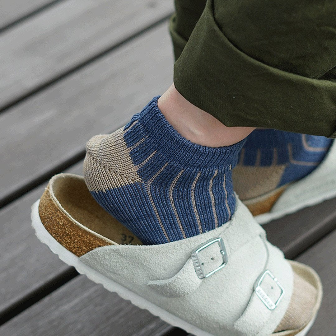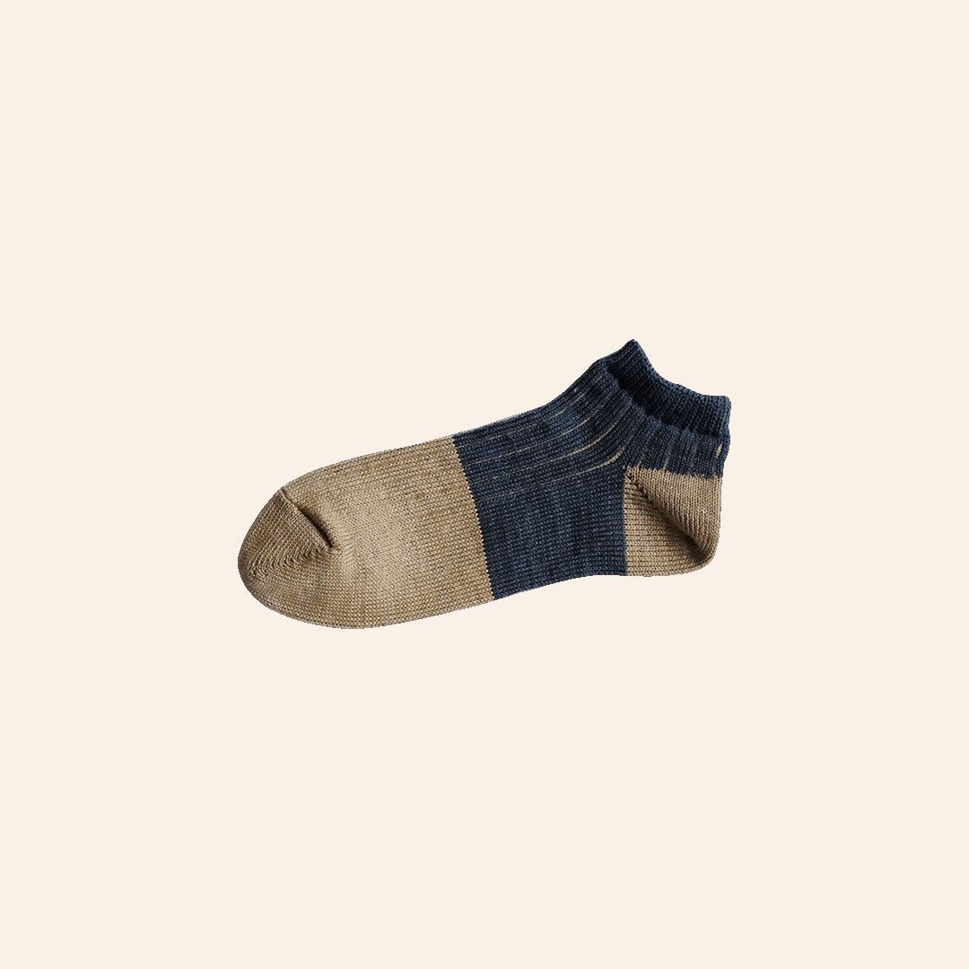 シャリ感と光沢が強い「リネン」と毛羽をカットした「コットンシルケット糸」を合わせたアンクルソックスです。リネン独特のシャリ感をコットンシルケット糸をあわせることで、シャリシャリとした肌ざわりを少し抑えて、柔らかさをプラスしました。リネンらしい履き心地ですが、リネン100%よりも履きやすい靴下に仕上がりました。